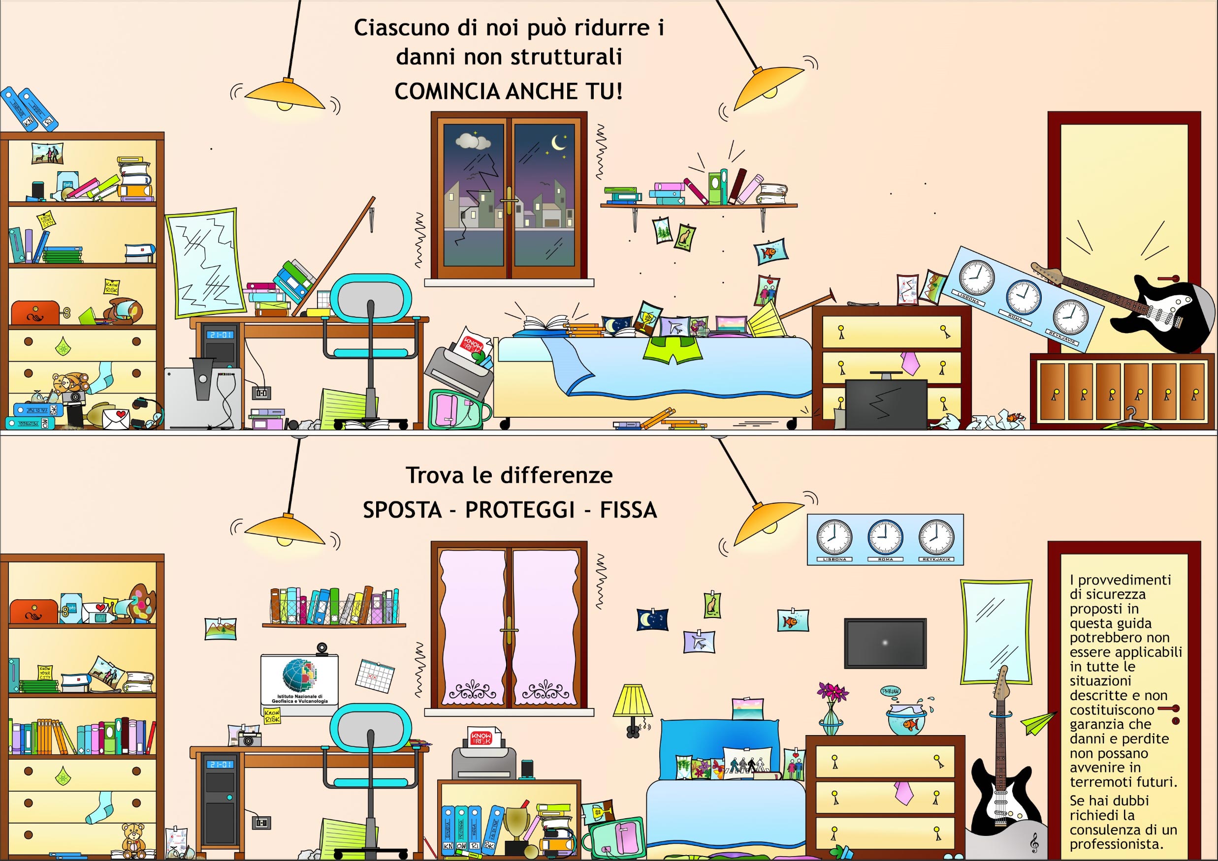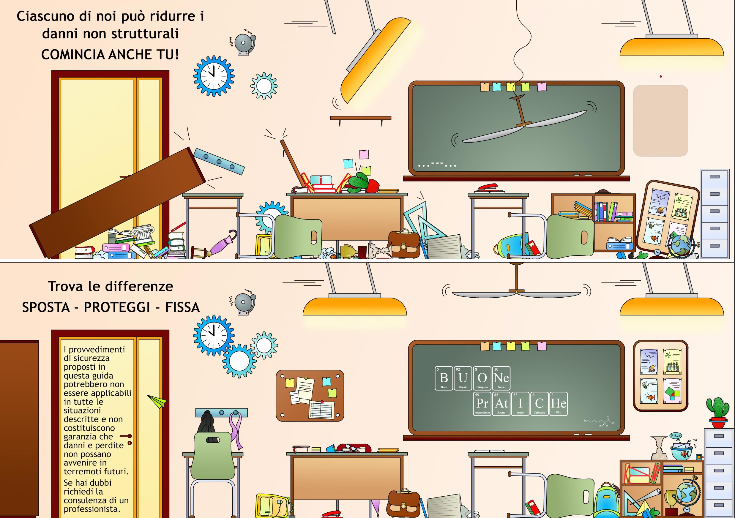 Sul tabellone del gioco sono raffigurati i possibili effetti di una scossa di terremoto in una camera da letto e in un’aula scolastica nei due seguenti casi:
